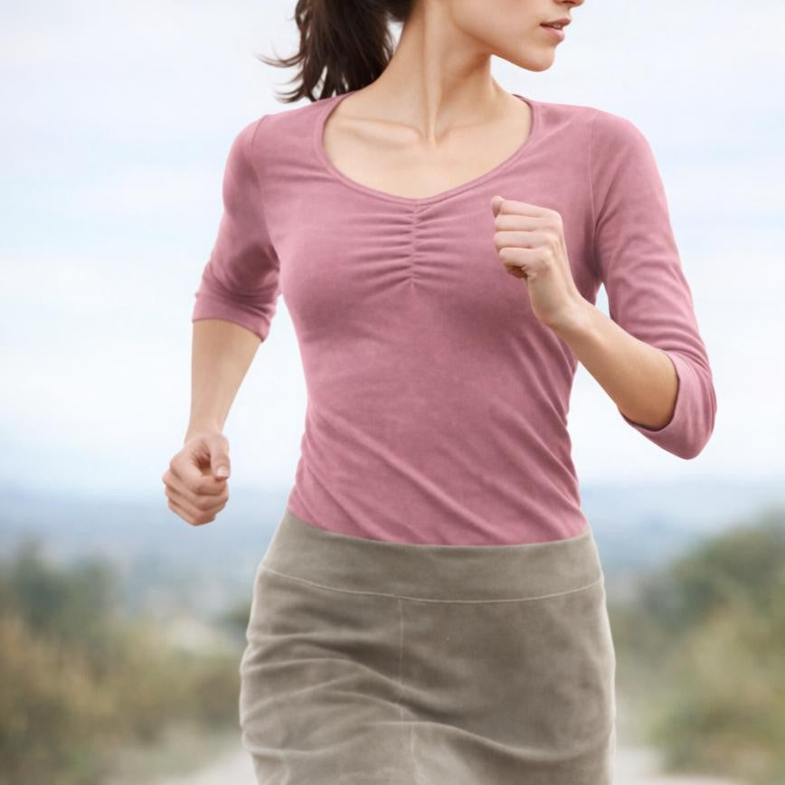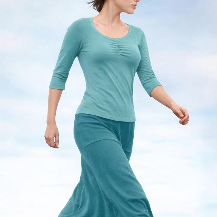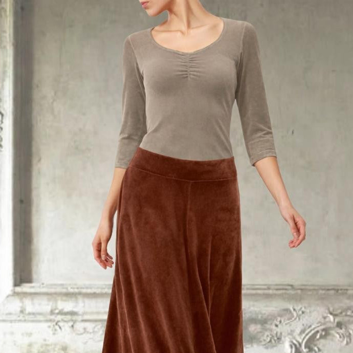 • Basic shirt. Deep drop shaped neckline, finished with jersey binding. Wrinkles on the chest. ¾ Sleeve. The organic velvet gives the shirt a rich appearance  and ensures  a perfect wearing comfort.