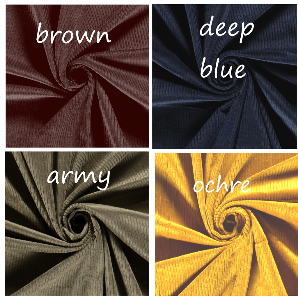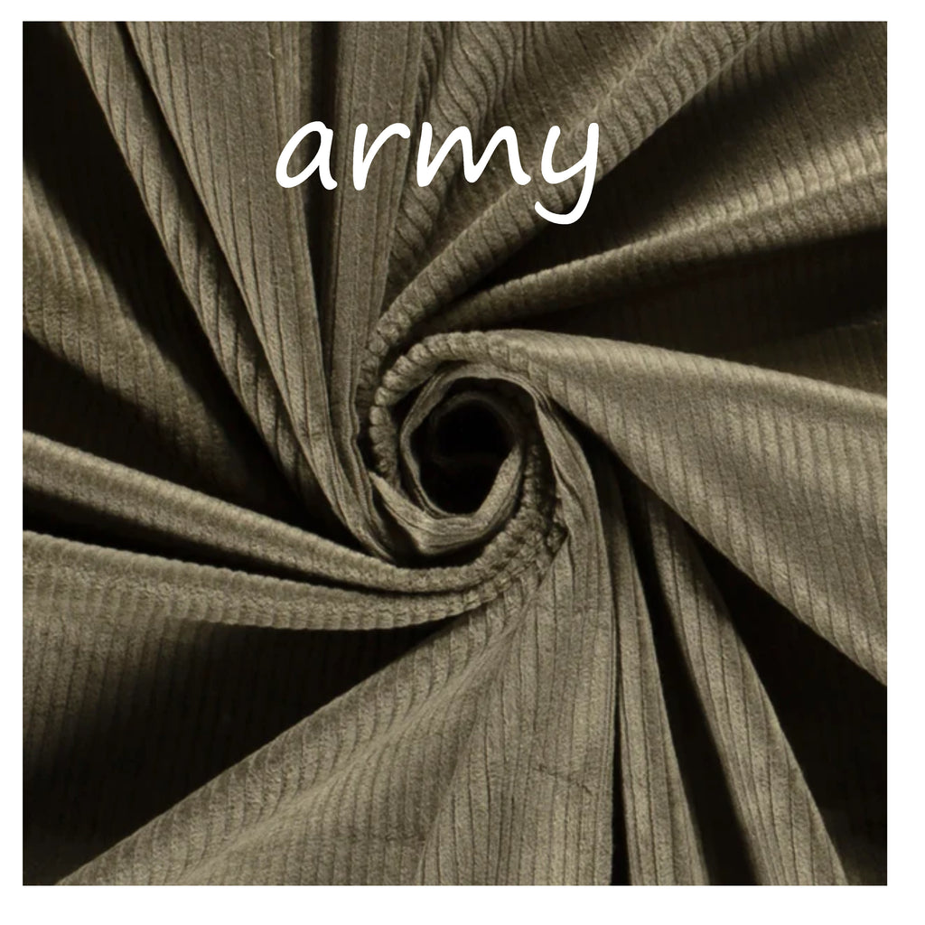 - STOF: Katoenen ribcord/corduroy met 3 % elasthan. Deze zwaardere stof heeft een brede ribbel (6 W) en is een stuk dikker dan fijne ribcord (16W) maar draagt door de toevoeging van elasthan toch comfortabel.