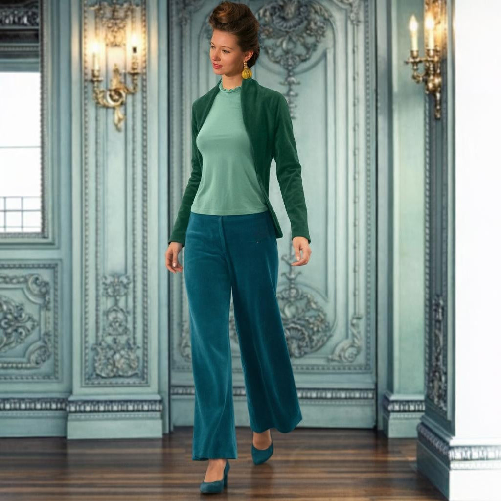 - Flared legged trousers with bended cut hip, finished with a tunnel with string. The bended cut double waistband ensures a perfect fit. Made of supple knitted cotton velvet.