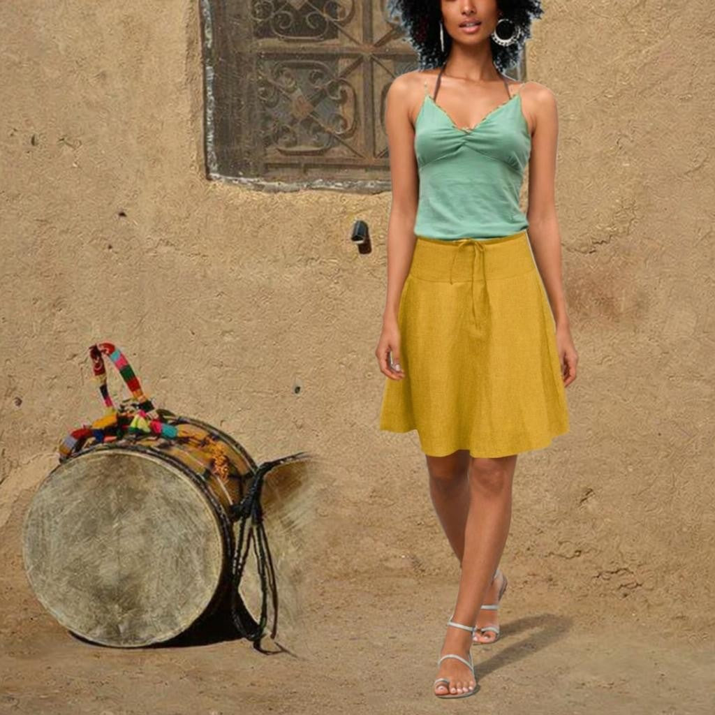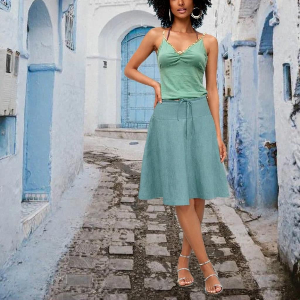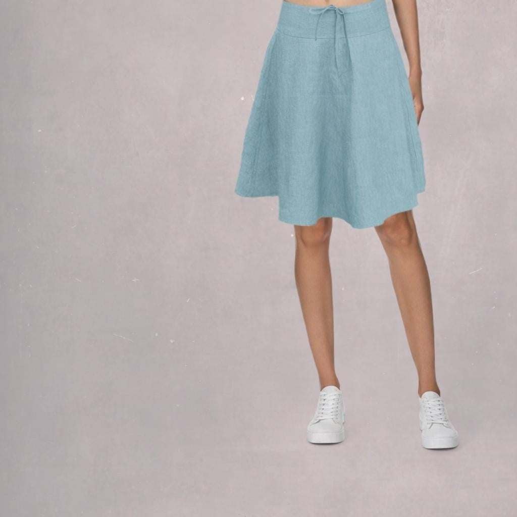 - Linnen klokrokje gemaakt van soepele gewassen linnen . De rok heeft een aansluitend rondgesneden heupstuk. De rok sluit met een rits middenvoor en is aansnoerbaar met een tricot koordje.