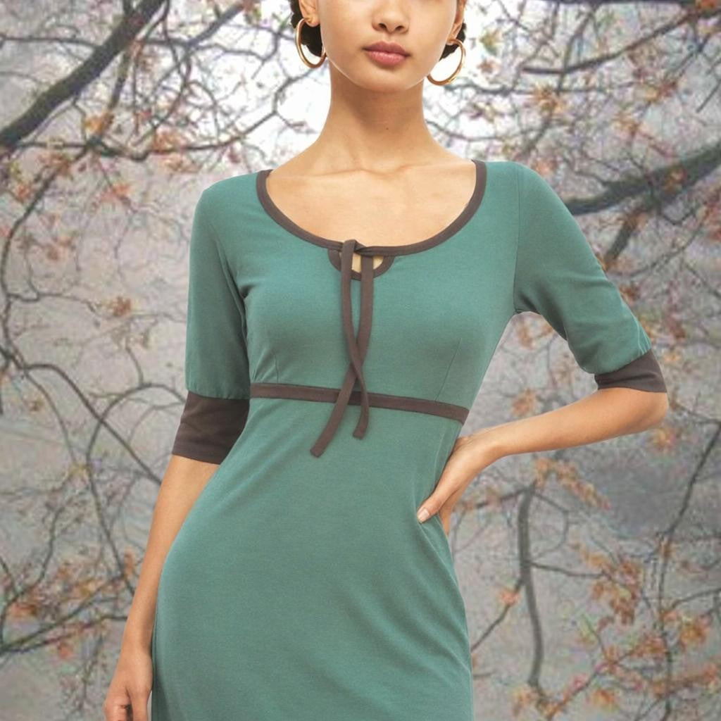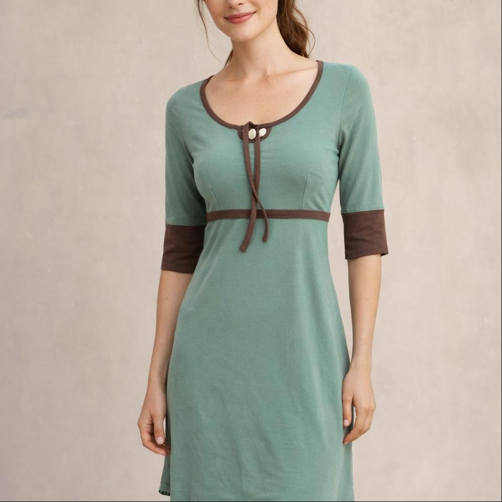• Dress with raised waist line. Close fitting bodice with slightly flaring skirt. The contrast neck binding can be knotted in various ways. Half long sleeve with double hem. Short sleeve with cuffed hem. Contrast binding at the neck, sleeve and hem. Made of sturdy, organic cotton single jersey.