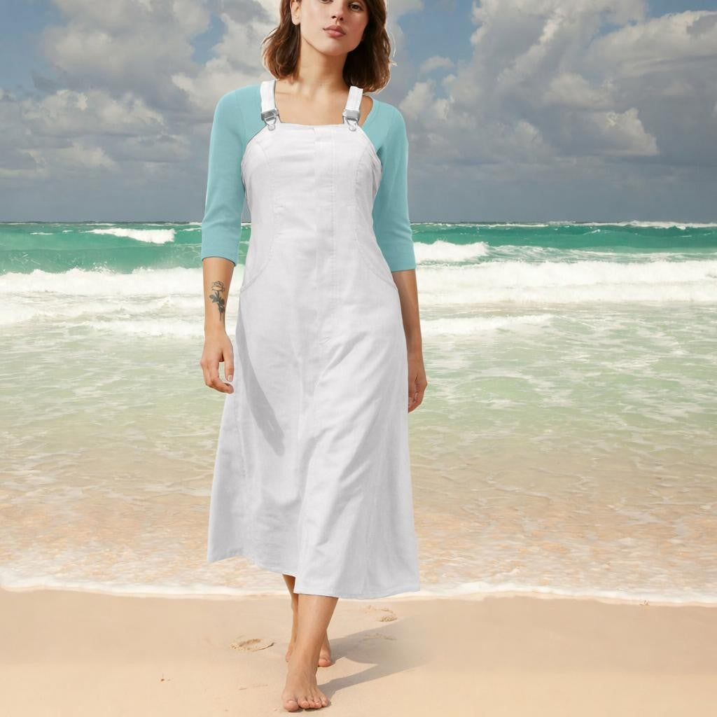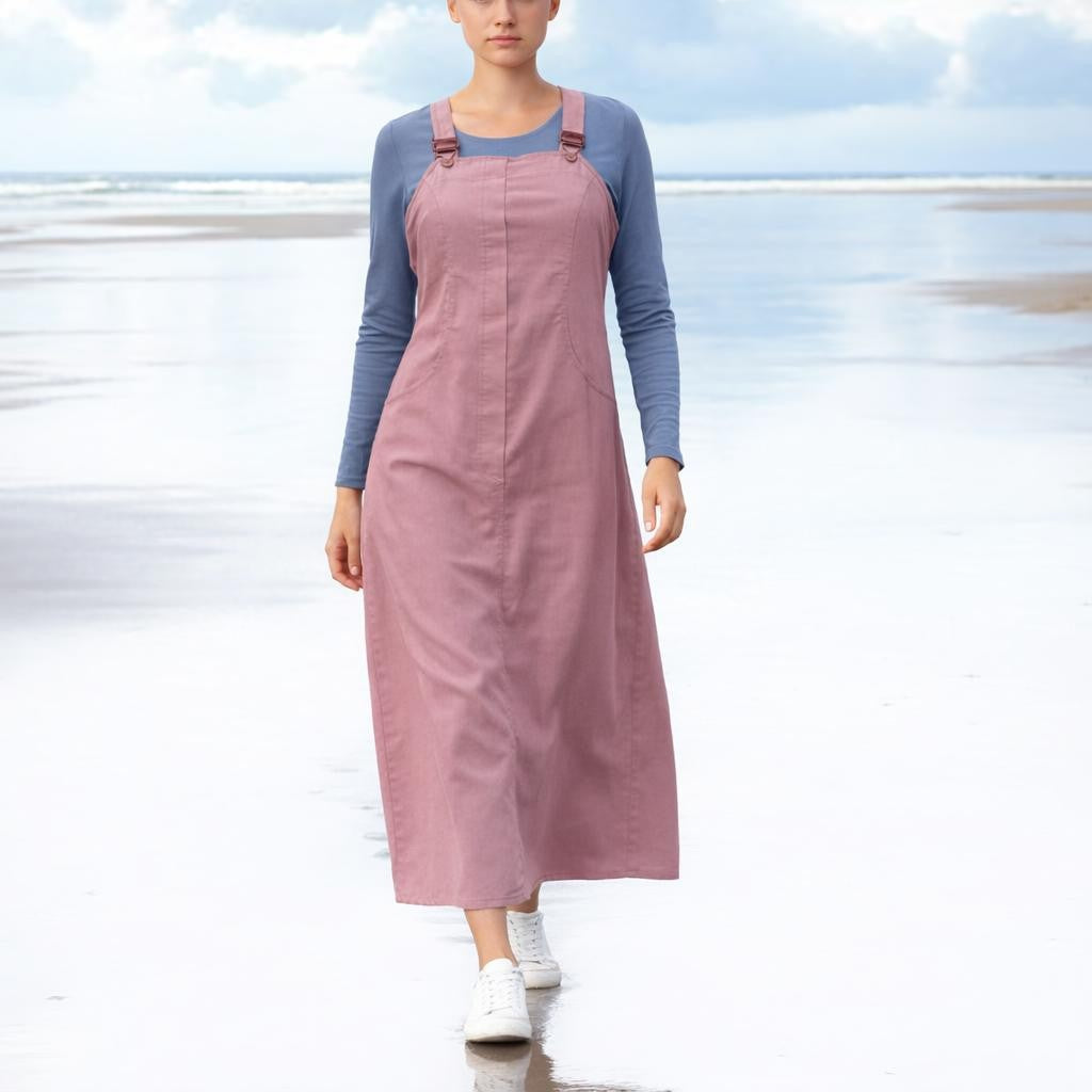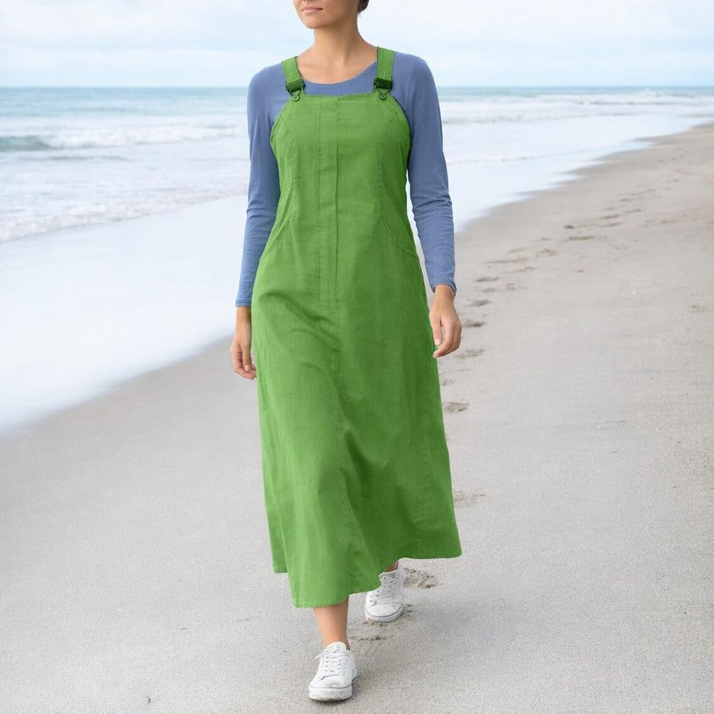 - Trending ankle-length pinafore dress in smooth corduroy. Beautiful female fitted bodice with flared skirt. Front and back pockets. Wear it with a simple T shirt, soft knit or stylish blouse. Great for the autumn and winter wardrobe.