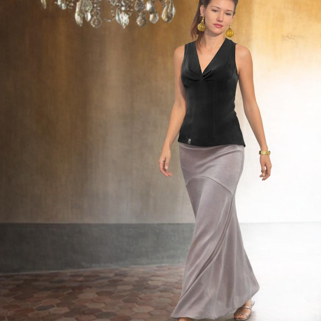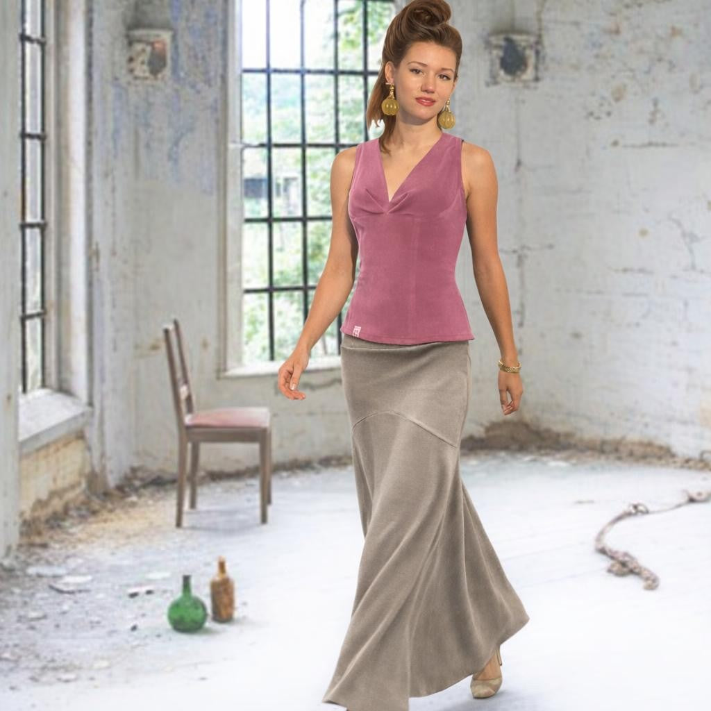 MODEL: Aansluitend in de taille en op heup. Deelnaad onder de borst met geplooide diepe V hals.