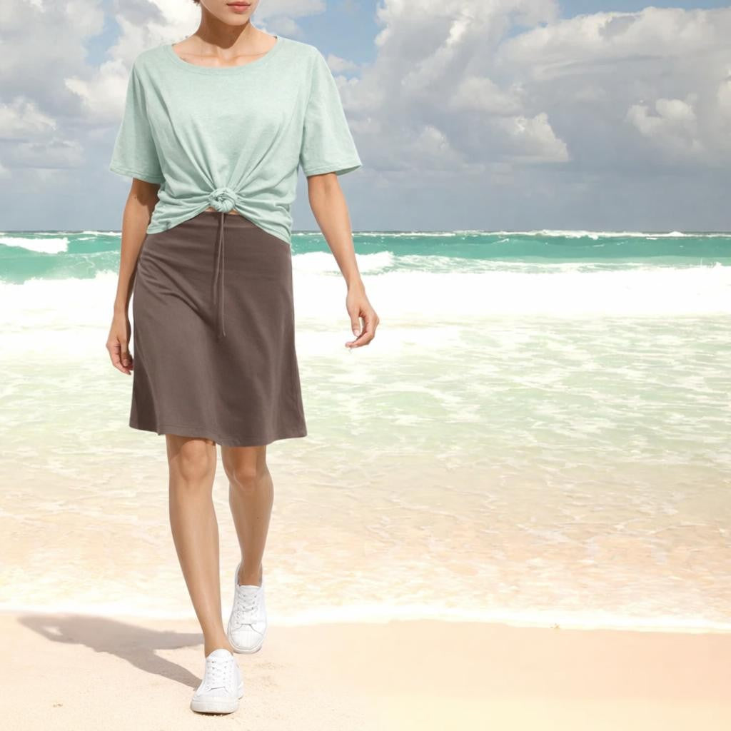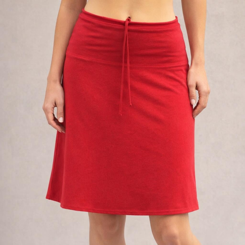 - Klokkend rokje met een dubbele rondgesneden heupband, afgewerkt met een tunneltje met koordje. Omdat het rokje op de heup en in de taille gedragen kan worden is de lengte variabel van net boven de knie tot kort. Gemaakt van stevige kwaliteit biologische katoenen single jersey.