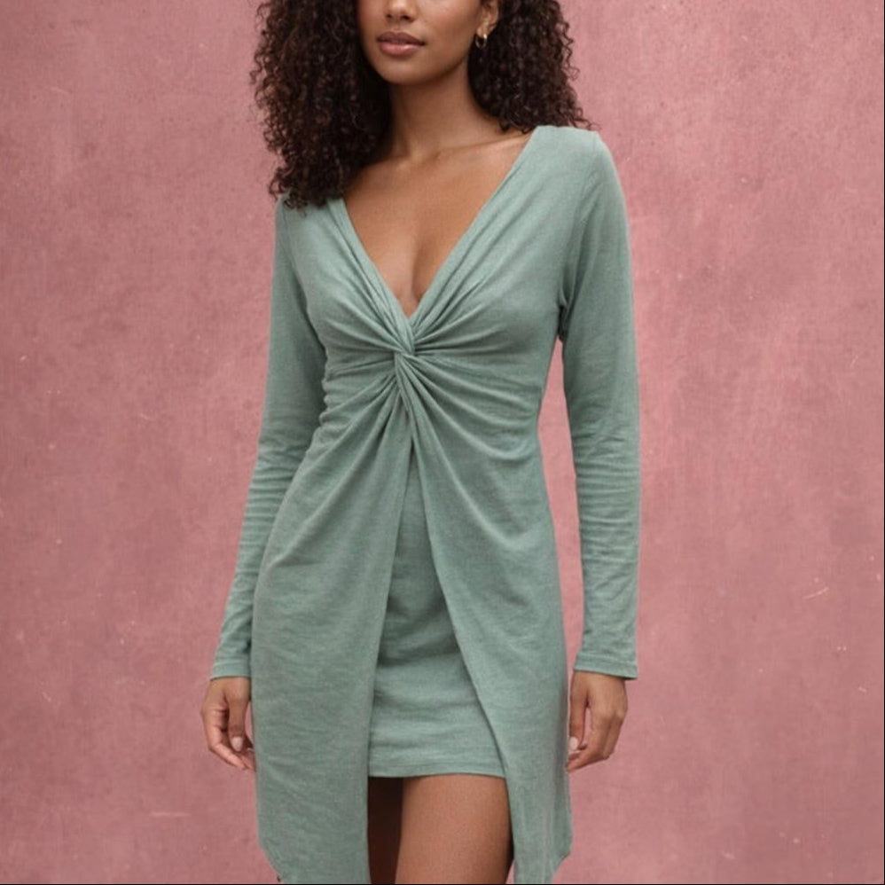 - Overjurkje met gedraaide knoop net onder de borst. Ideaal voor zomeravonden over strapless jurkjes of hemdjes. Het jurkje valt ruim over de taille en heup. Gemaakt van soepelvallende zomerse biologische slubtricot.