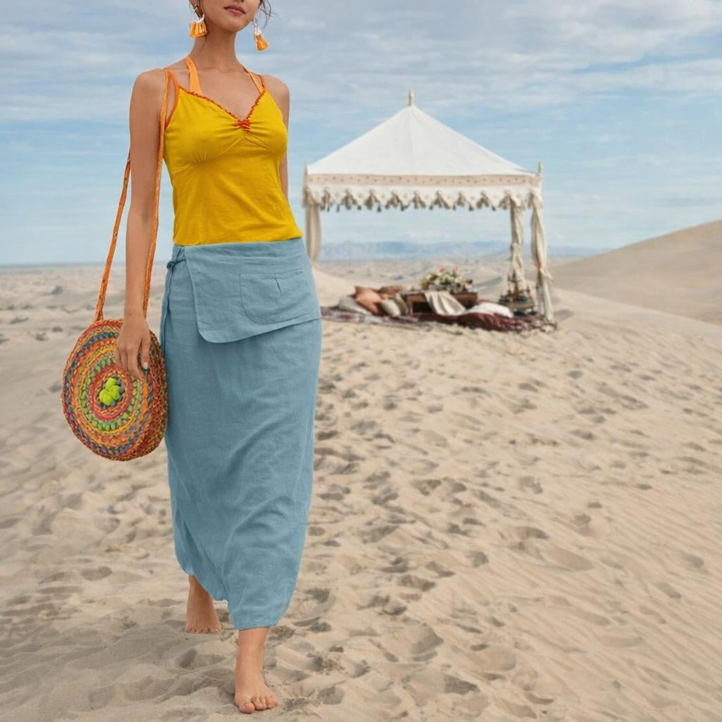 Linnen maxi rok gemaakt van soepele gewassen linnen. Deze overslagrok sluit in de taille met D ringen en is aansnoerbaar met band.