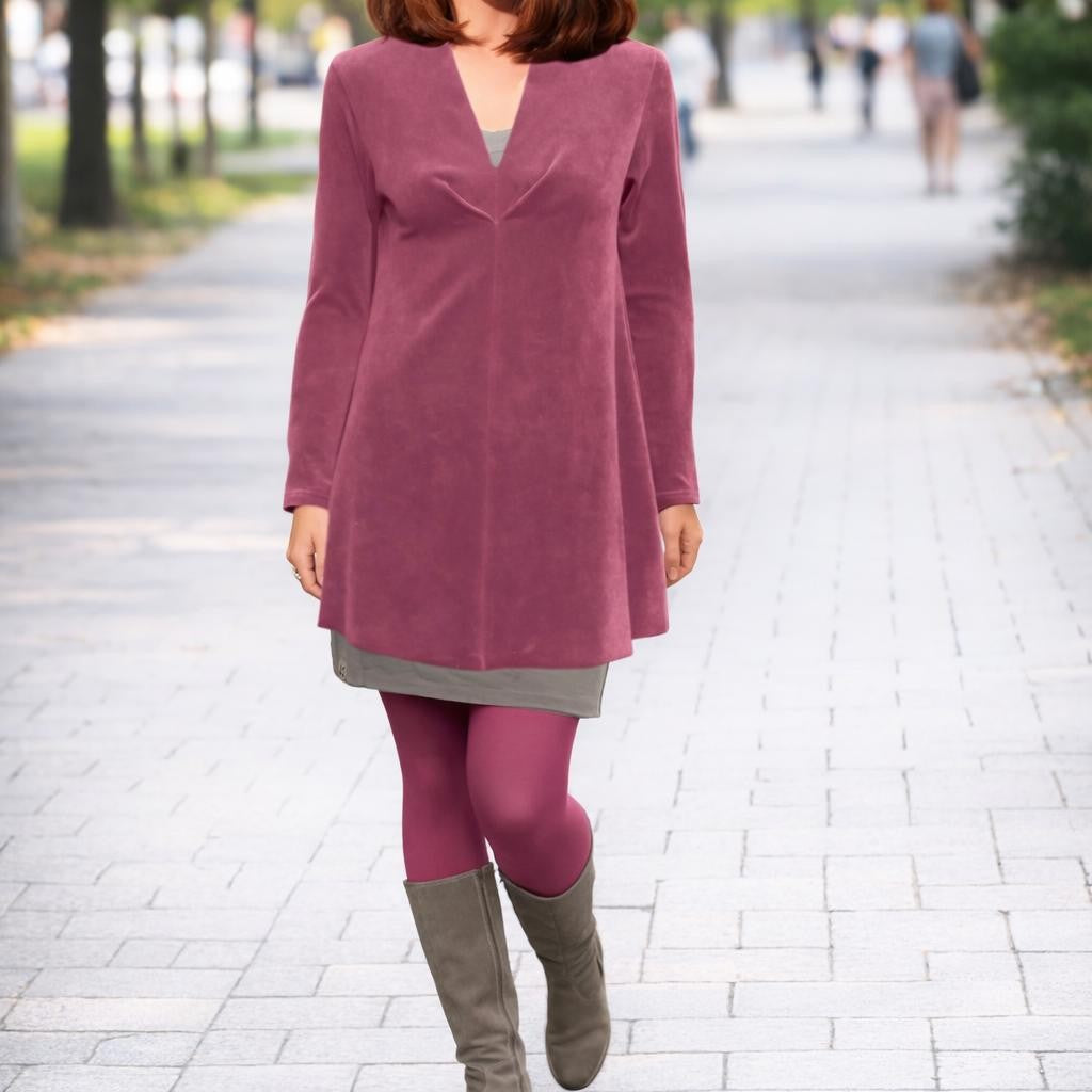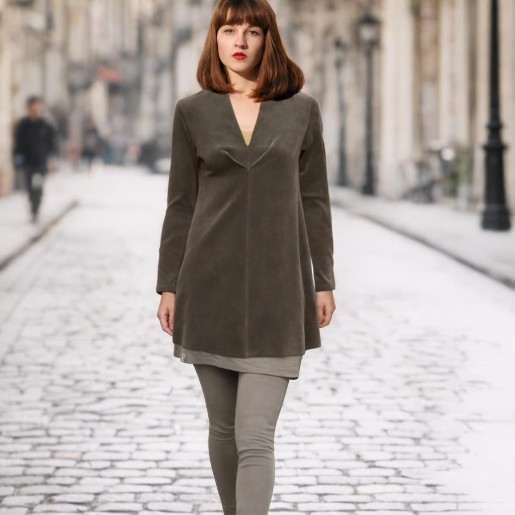 A line tunic with a pleated deep V-neck. Made of comfortable stretchy cotton velour.