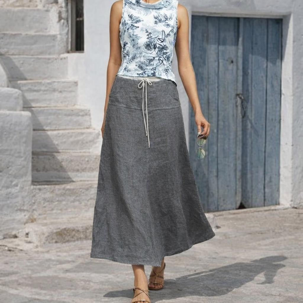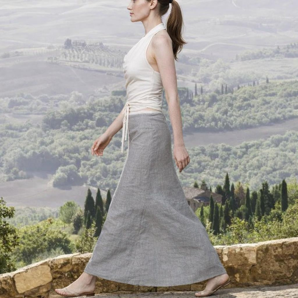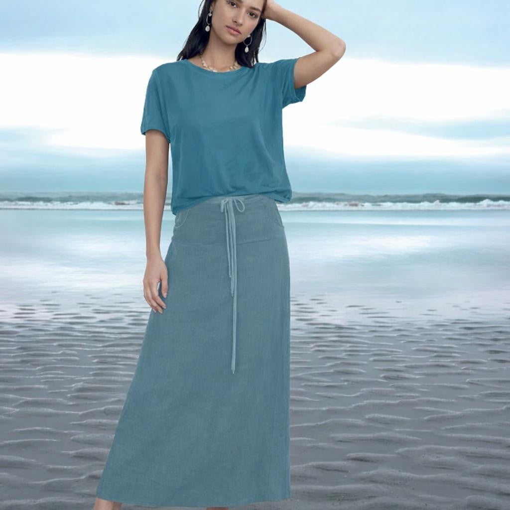 • Long linen summer skirt, made of supple, summery, lightweight linen. The skirt has a fitting,round cut hip part with pockets. It closes with a zipper at the center front and is adjustable by a jersey draw string.