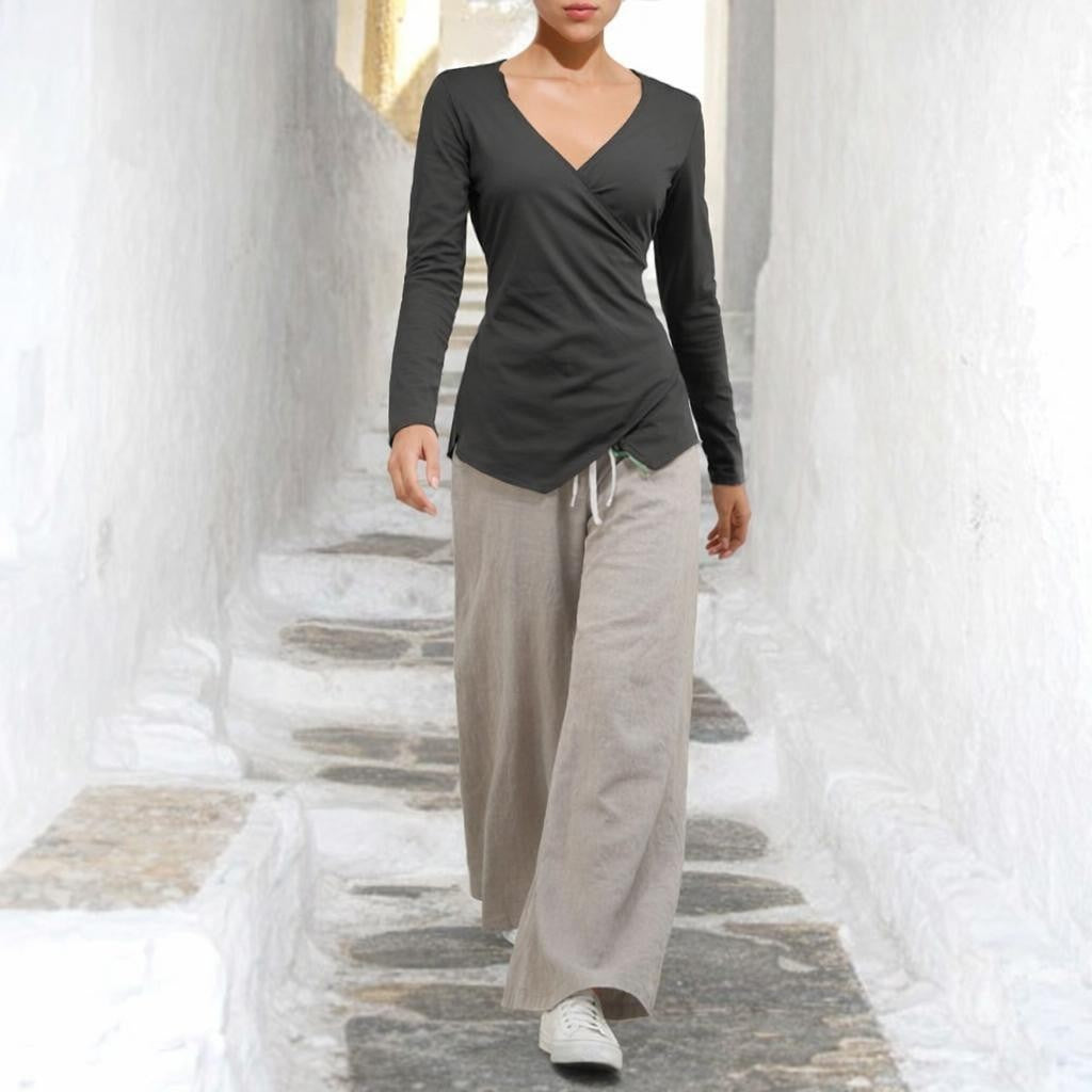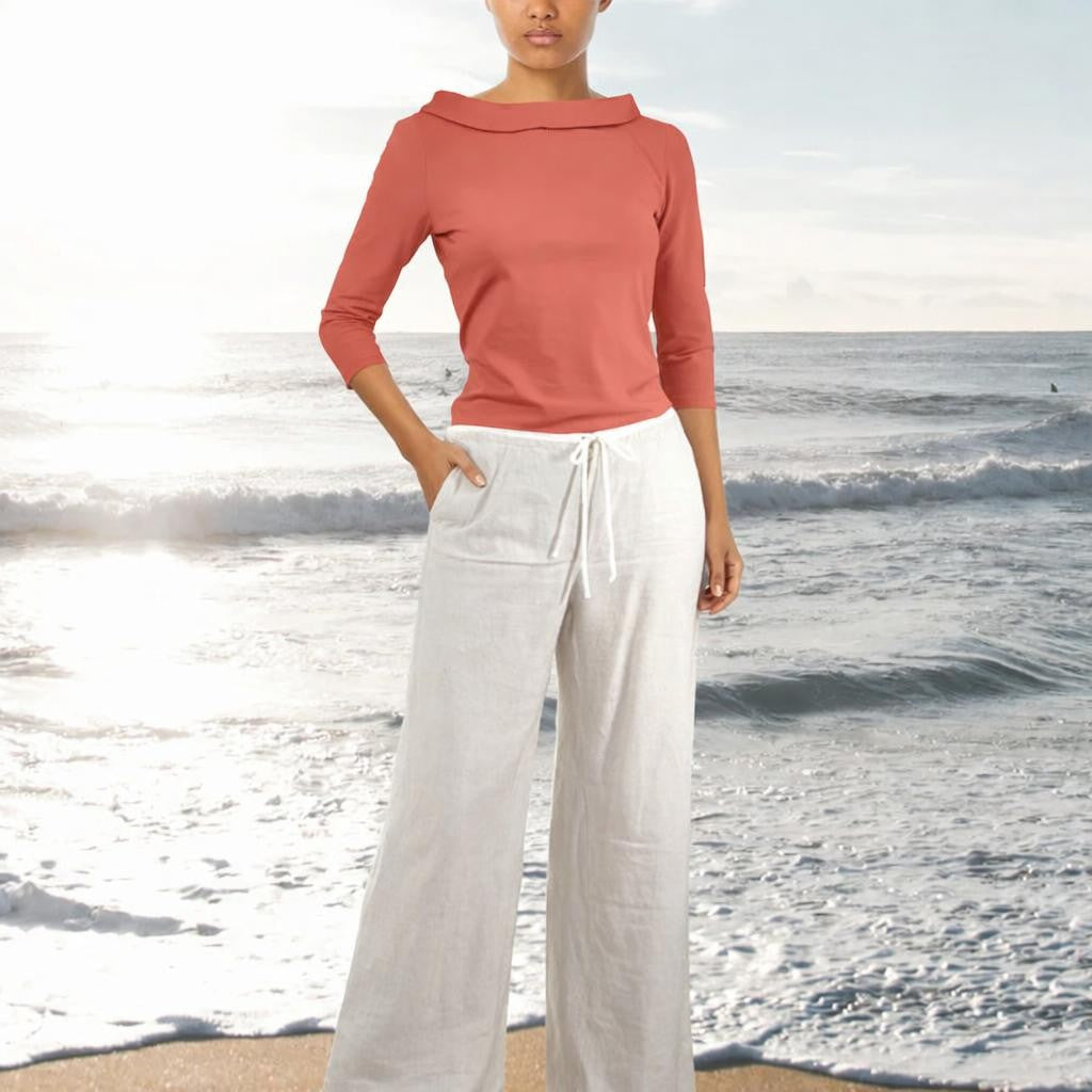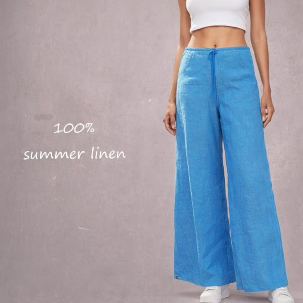 - Linen summerpants with very wide legs, made of supple, lightweight, summery linen, softly draping. The pants have a fitting, round cut hip with pockets. The pants close with a zipper at the center front and can be adjusted with a jersey drawstring.