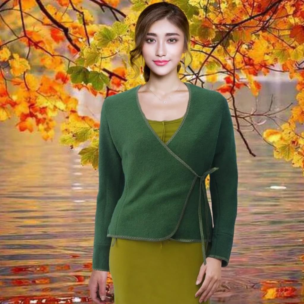 Vest close (wrapover) with a string at the waist. All inner seams are finished with a handcrafted cocotte stitch. - Fabric;100% boiled wool. Unfortunately certified wool is not yet widely available. Nevertheless we think it has to be included in our collection because it is a beautiful and sustainable product. It provides excellent comfort wearing: cool in summer, warm in winter. Wool has highly breathable and moisture wicking qualities. Thanks to its natural fat content it is self-cleaning and dirt-repellant. Furthermore wool is 100% recyclable.