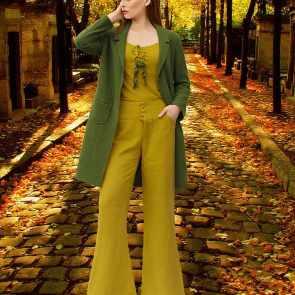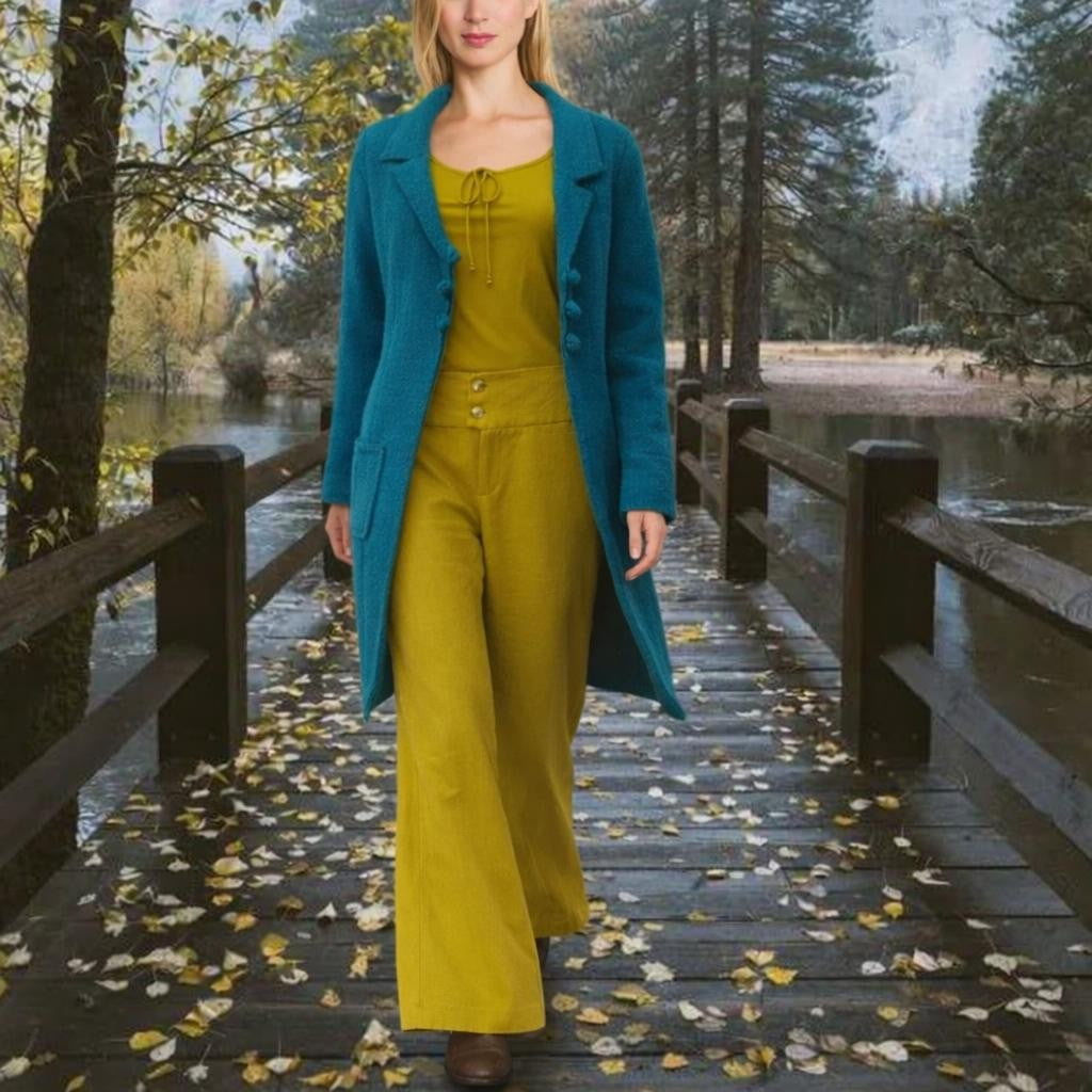 • Lang getailleerd colbert-vest gemaakt van 100 % gekookte wol. De gekookte wol is gebreid en dus iets rekkend waardoor het comfortabel draagt. Zowel de binnen en buitenkant naden als ook de zomen zijn afgewerkt met rustieke gekartelde naden.  Ook de knopen zijn gemaakt van gekookte wol.  Bij dit ontwerp is gestreefd naar een kledingstuk dat makkelijk recyclebaar is. Op weg naar een afval loze maatschappij waarin alles recyclebaar is of in ieder geval biodegradeerbaar (makkelijk af te breken), is er bij dit ontwerp voor gekozen om uit te gaan van 100% mono materiaal. Er zijn dus behalve de 100% wollen stof geen andere stoffen gebruikt voor b.v. voering of andere onderdelen. Er zijn ook geen vastzittende fournituren zoals knopen of ritsen gebruikt. Het kledingstuk kan zo gerecycled worden zonder dat er eerst onderdelen uit elkaar gehaald hoeven te worden.
