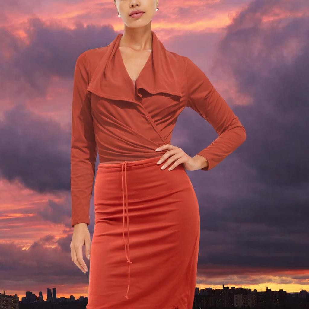 - This close fitting pencil skirt has a double round cut waistband, finished with a little tunnel and cord. As the skirt can be worn as well on the hip as in the waist, its length can bed varied from just above the knee to short. Made of strong quality biological cotton single jersey.