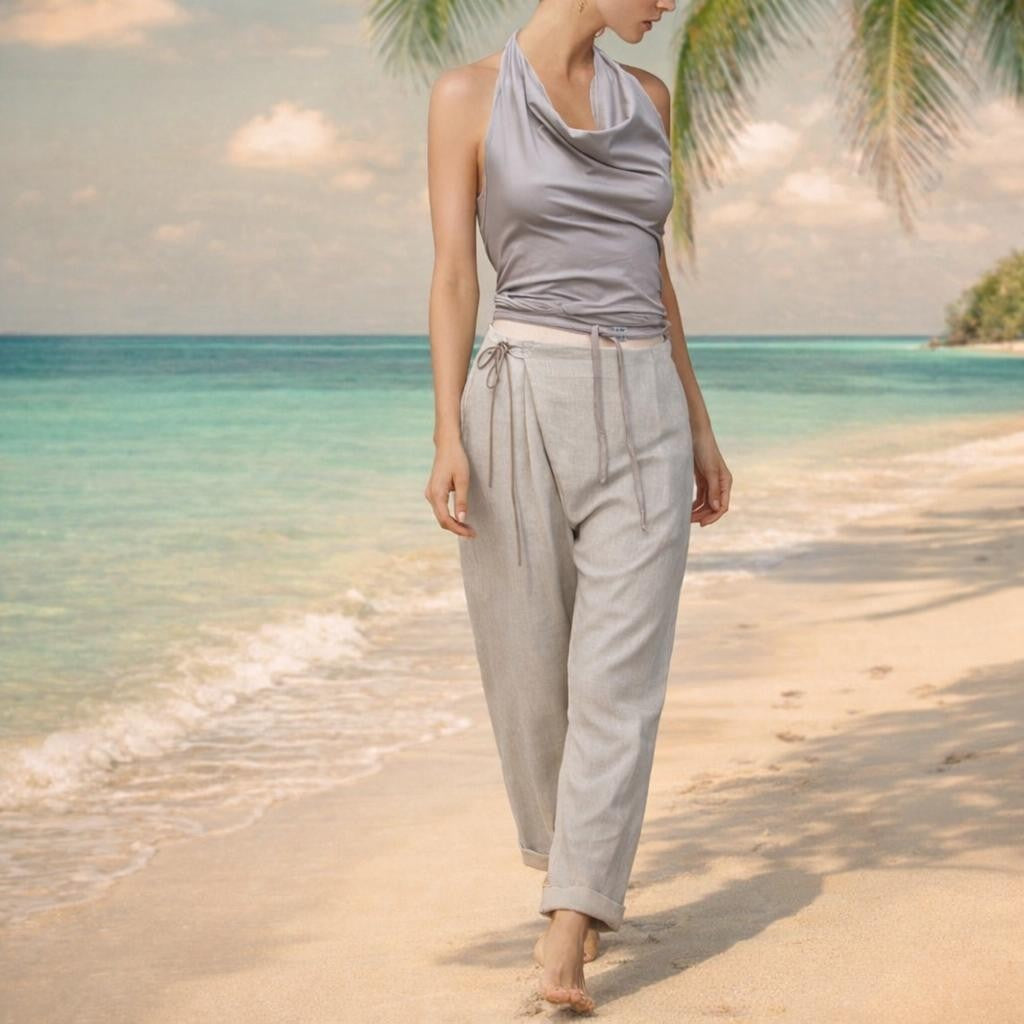 - Comfortable pleated pants. The pants have two side pockets and a straight leg. The pants have no zipper but are closed with a slash over fold and a leather string with which you can adjust your waist to your own taste.. It is made of 100% biological linen. With this design we have strived for a garment which is easy to recycle: on the way to a waste- free society where everything is recyclable or at least biodegradable we chose with this design to start from 100% monomaterial. This means that no other fabrics than linen are used for the lining or other parts. No tied haberdashery like buttons or zippers are used. The garment can be recycled as such, without disassembling parts.